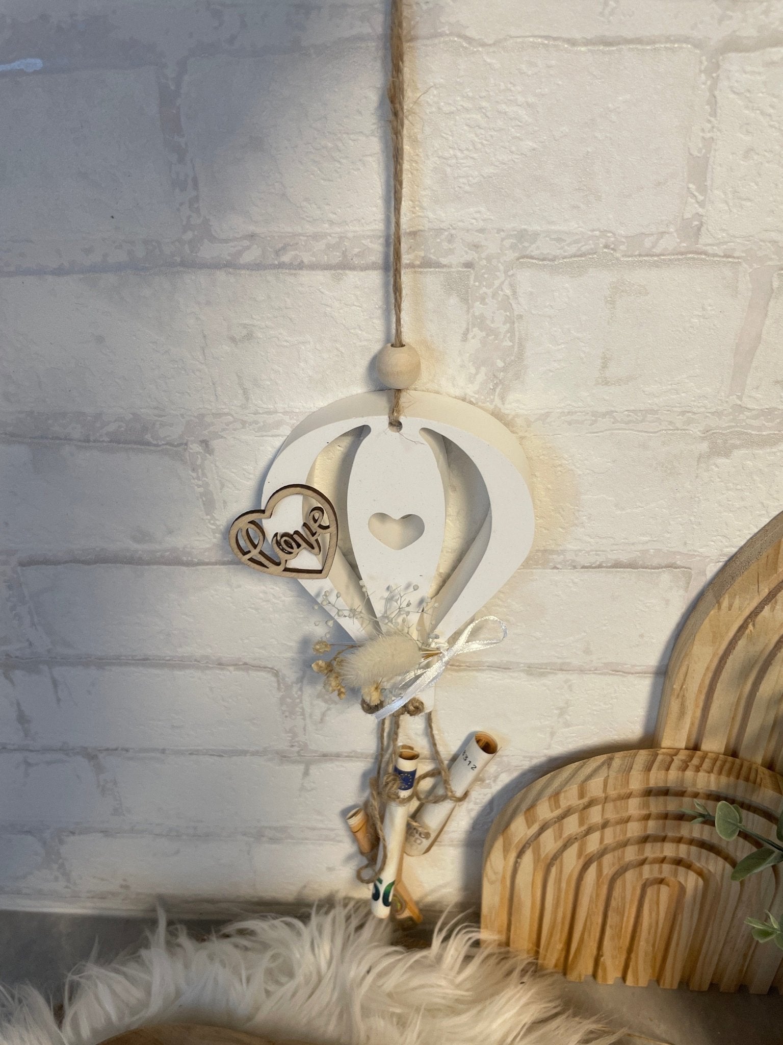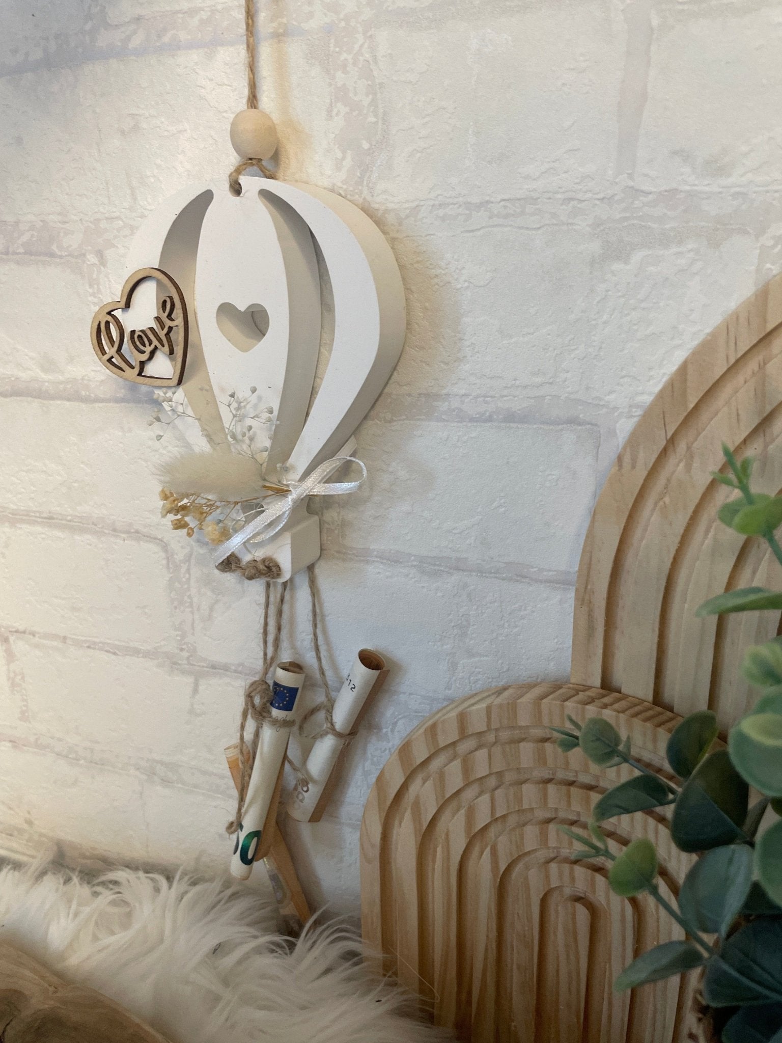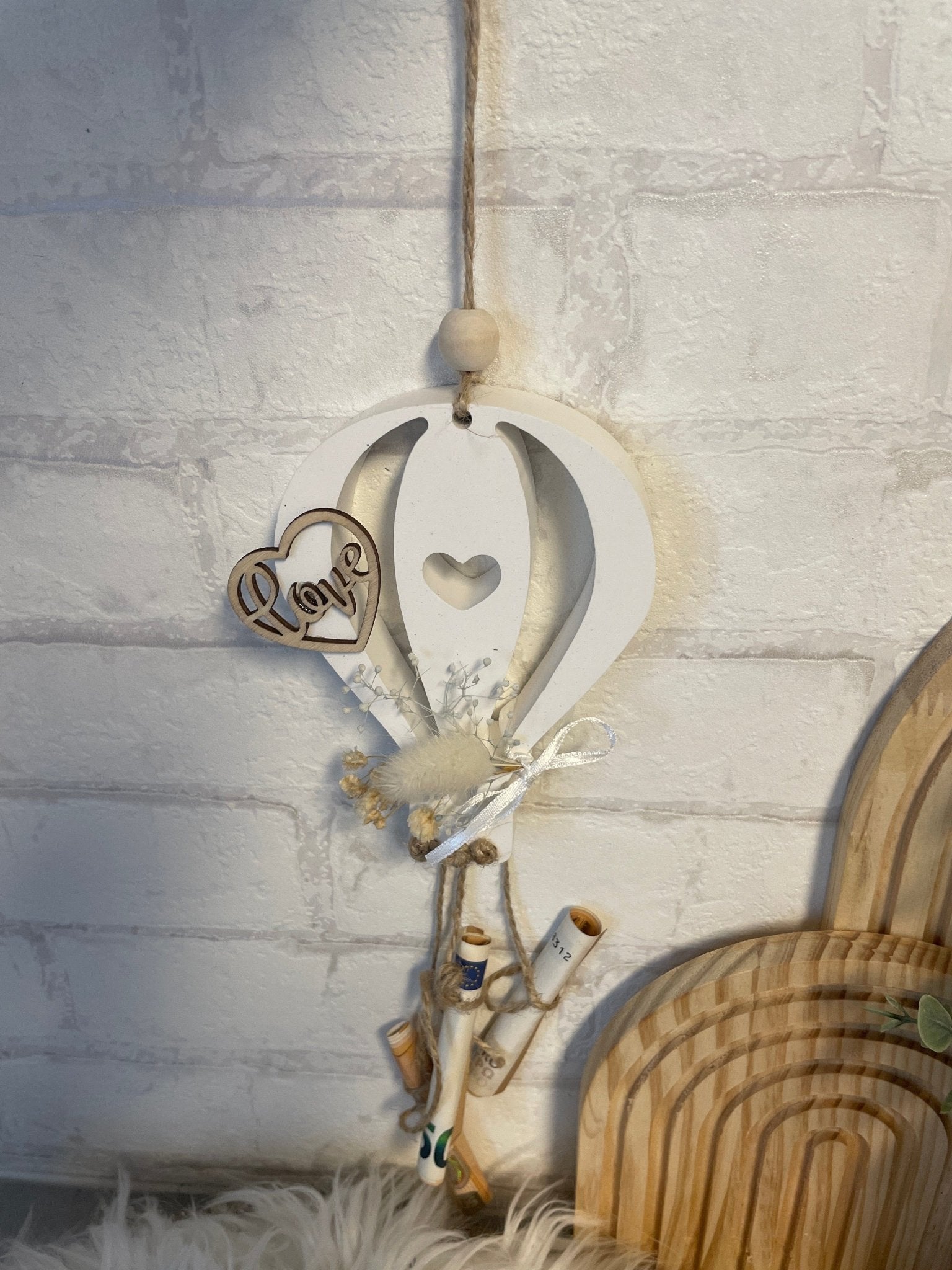 Mit ihrem ausgestanzten Herz, filigranen „Love“-Anhänger, Trockenblumen und Juteschnur verleiht sie jedem Raum eine sanfte, romantische Note.