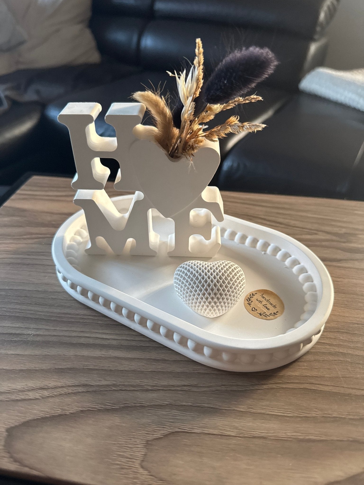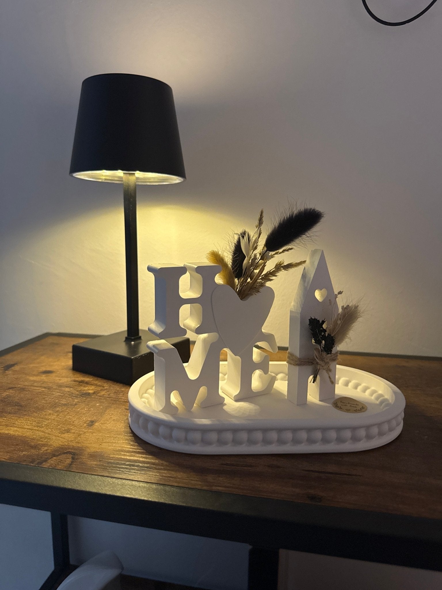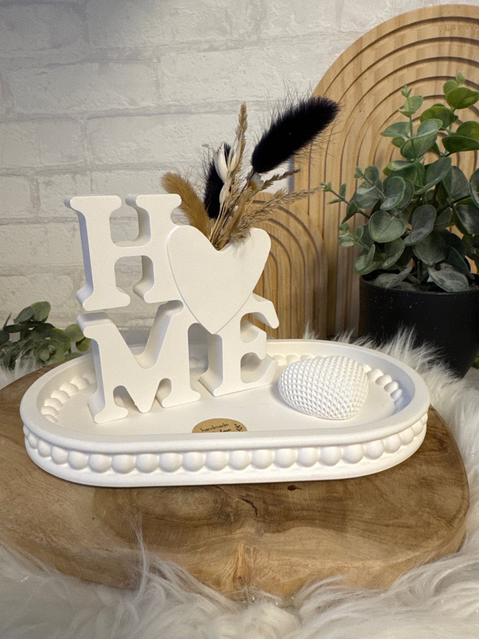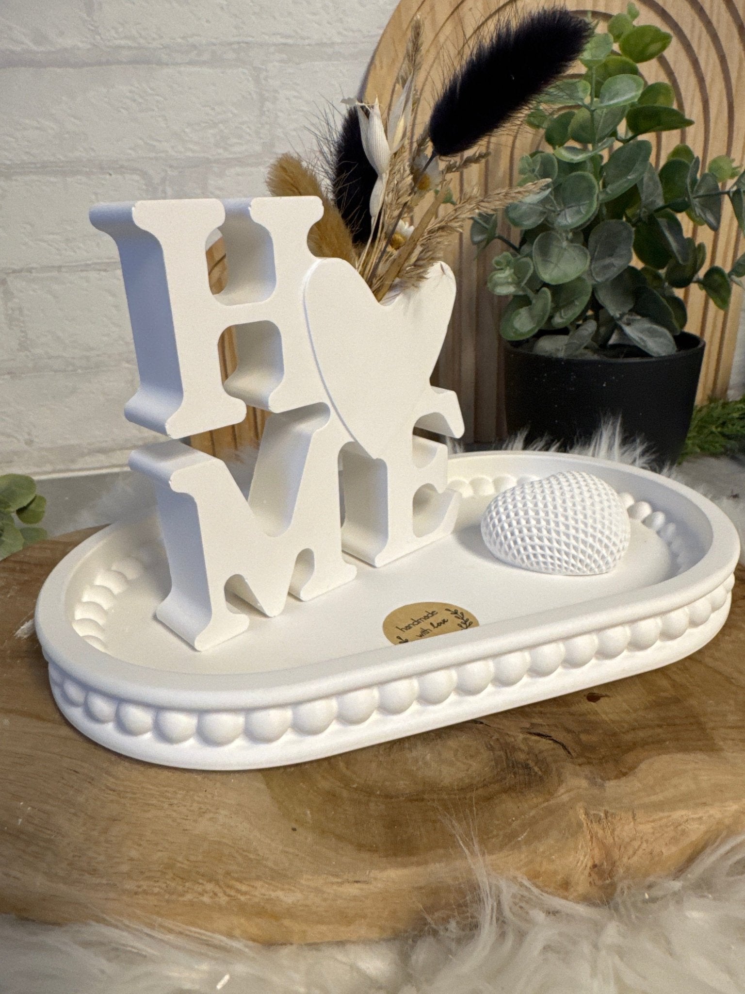 Der feine Perlenrand, der dezente Schriftzug „Home“ und ein kleines Herz-Detail machen dieses Stück zu einem besonderen Hingucker – ideal, um deine Lieblingsdeko stilvoll zu präsentieren.