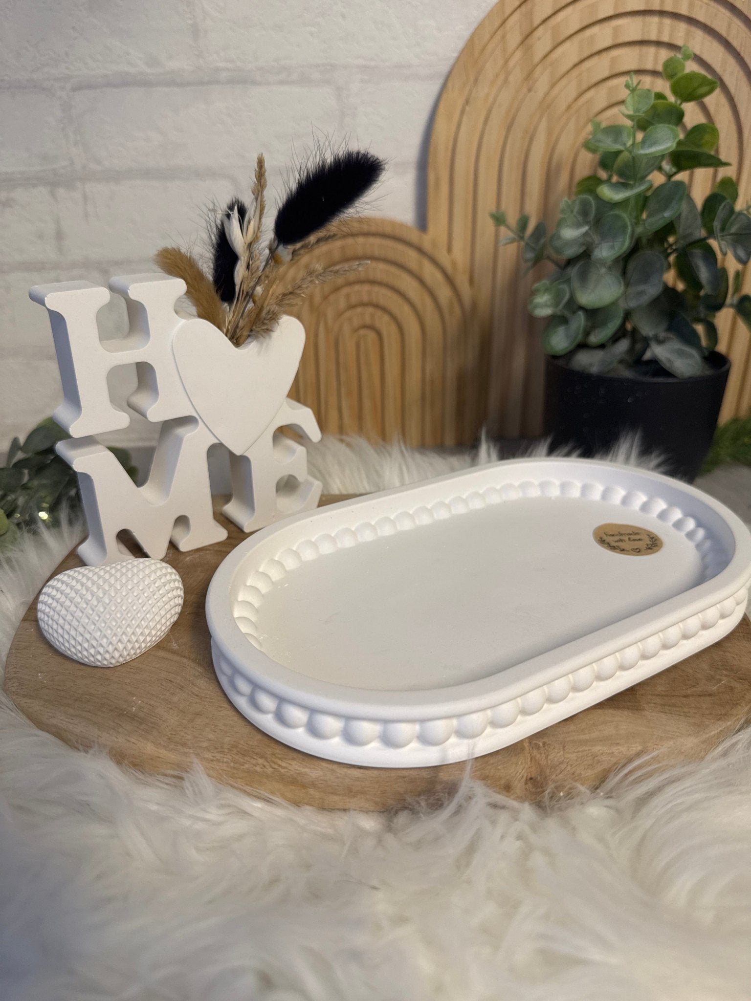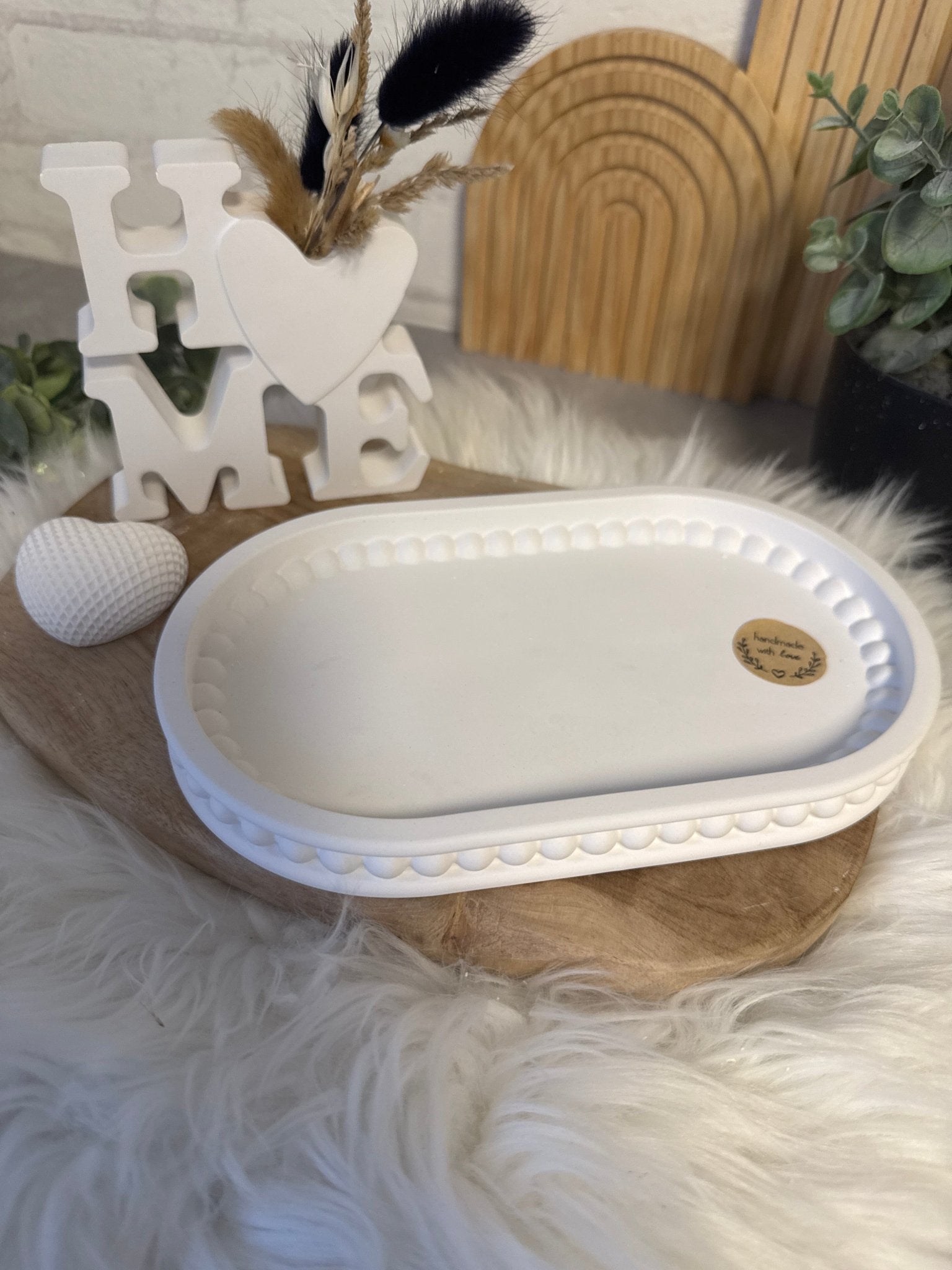 „Weißes Tablett mit Perlenrand & Herz – Raysin/Keraflott Deko mit Schriftzug Home“
