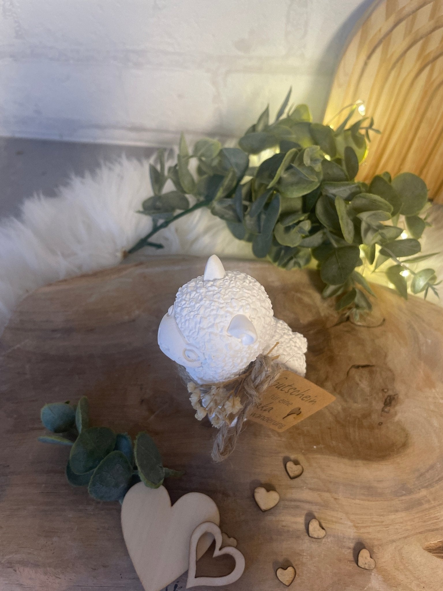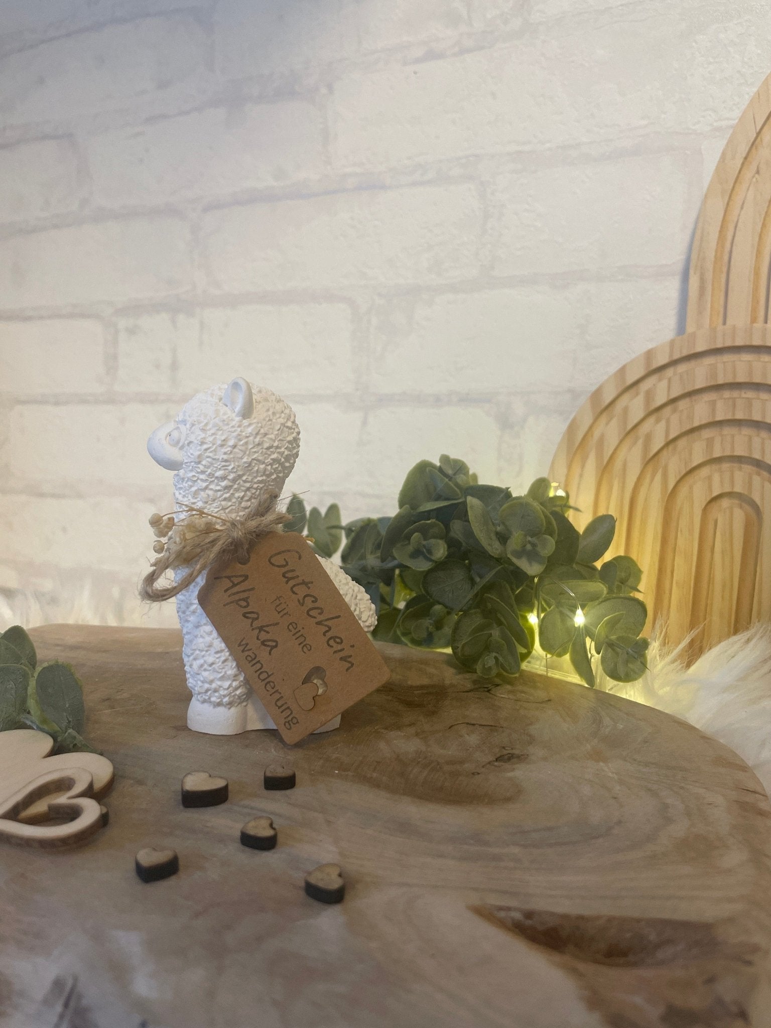 Die kleine Dekofigur aus Keramik oder Gips (je nach Material) trägt einen Anhänger mit der Aufschrift „Gutschein für eine Alpakawanderung“ – perfekt als originelle Geschenkverpackung für echte Alpaka-Fans.