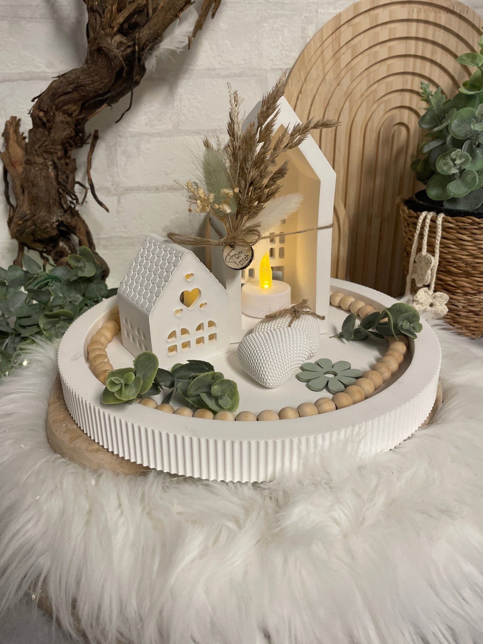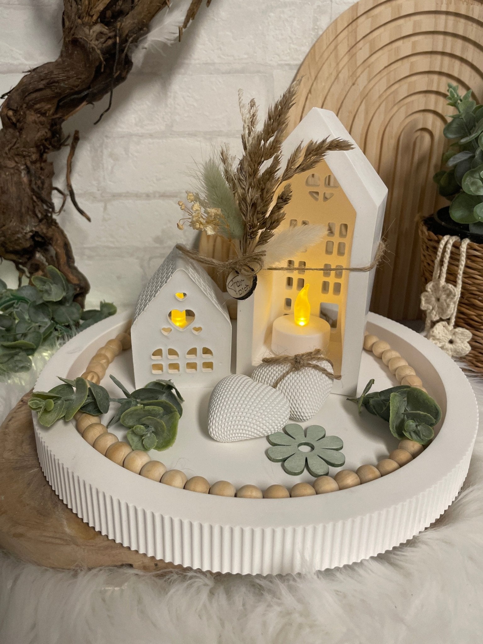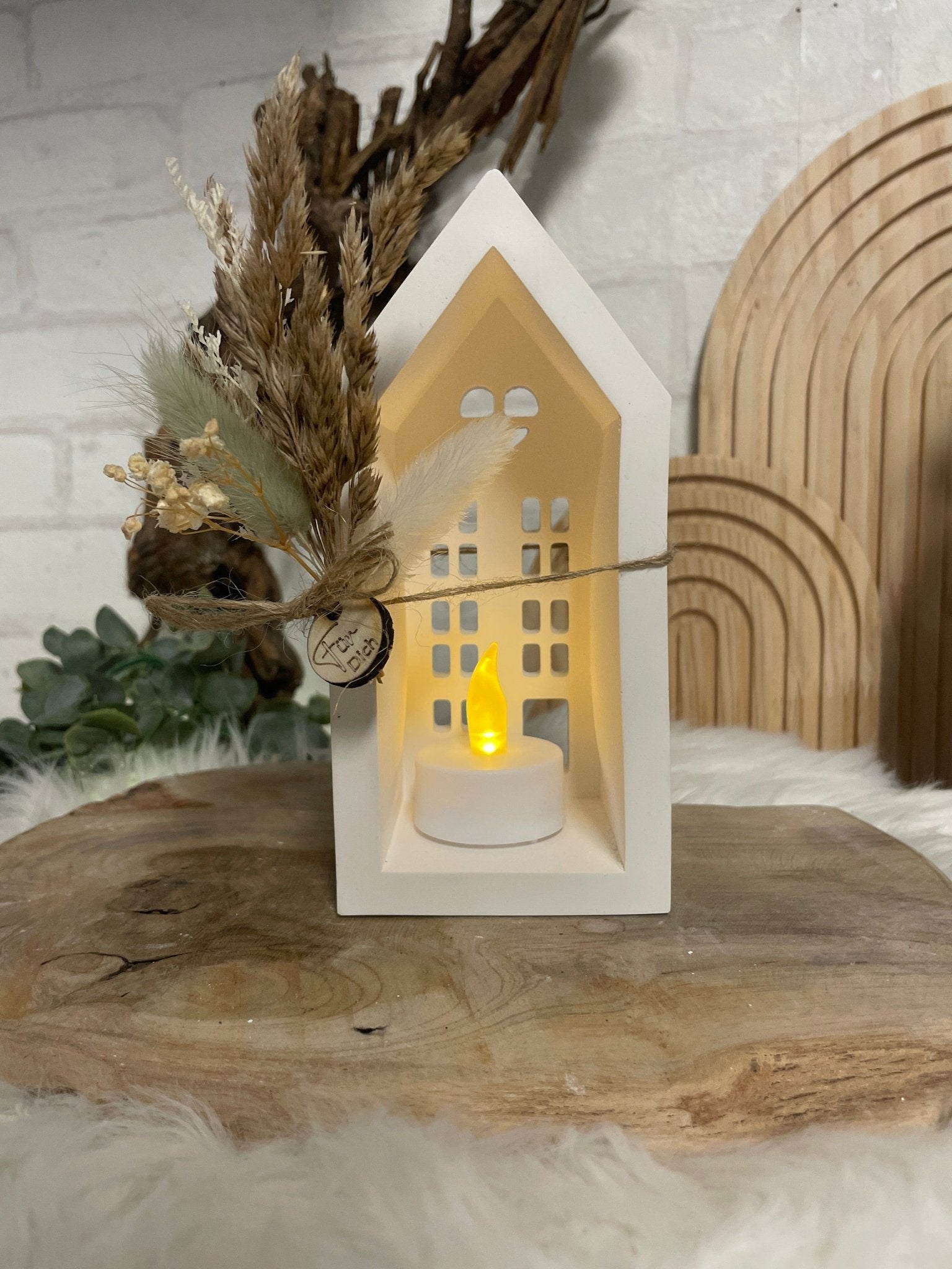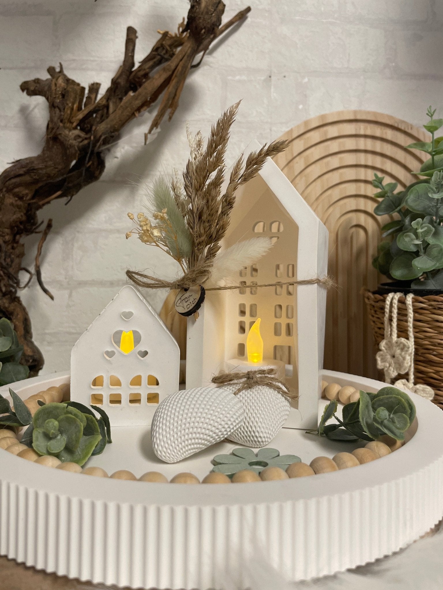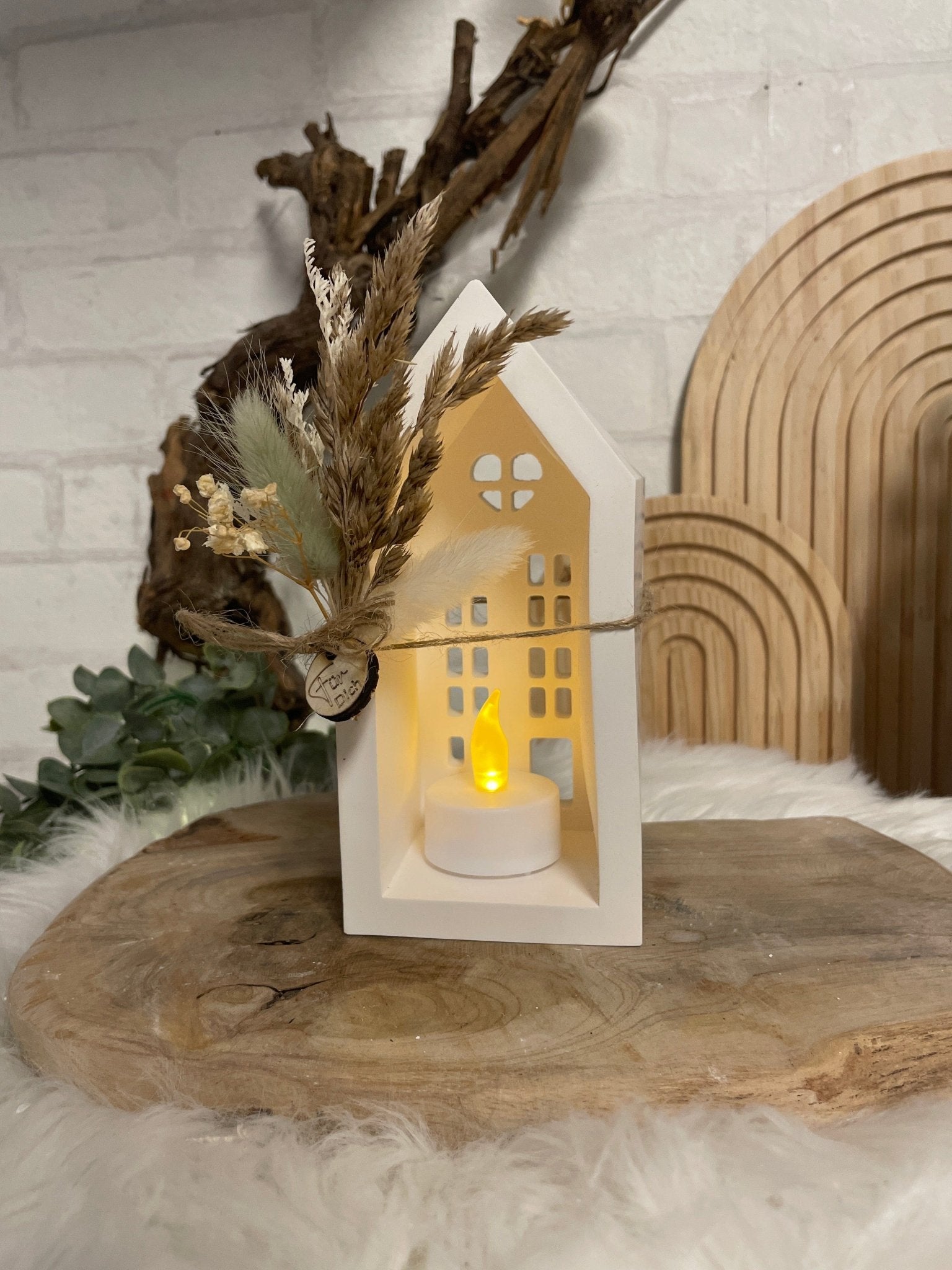 Bringe skandinavisches Flair in dein Zuhause mit diesem handgemachtes Deko-Set aus eleganten Häuschen, Trockenblumen und warmem LED-Licht.