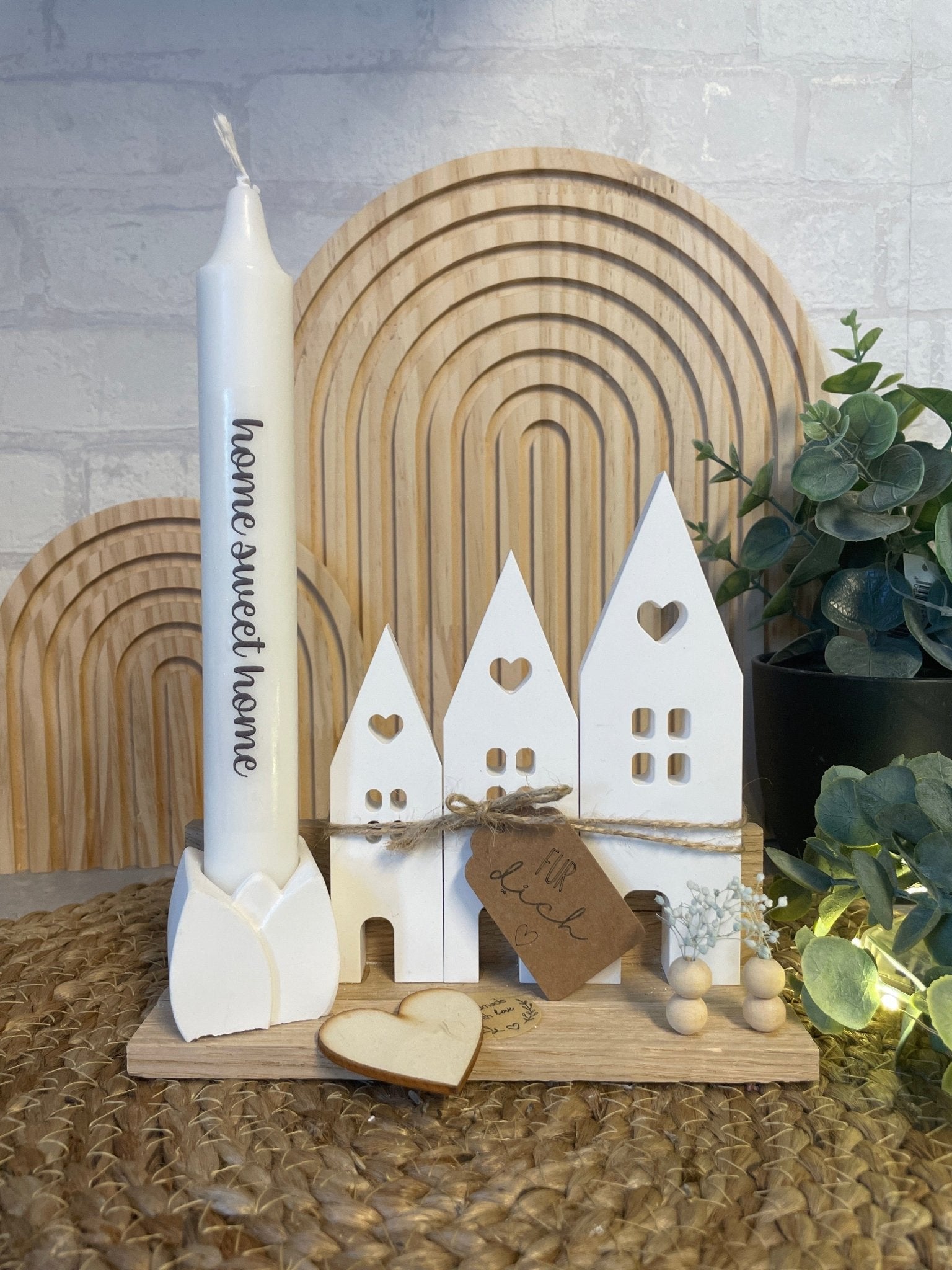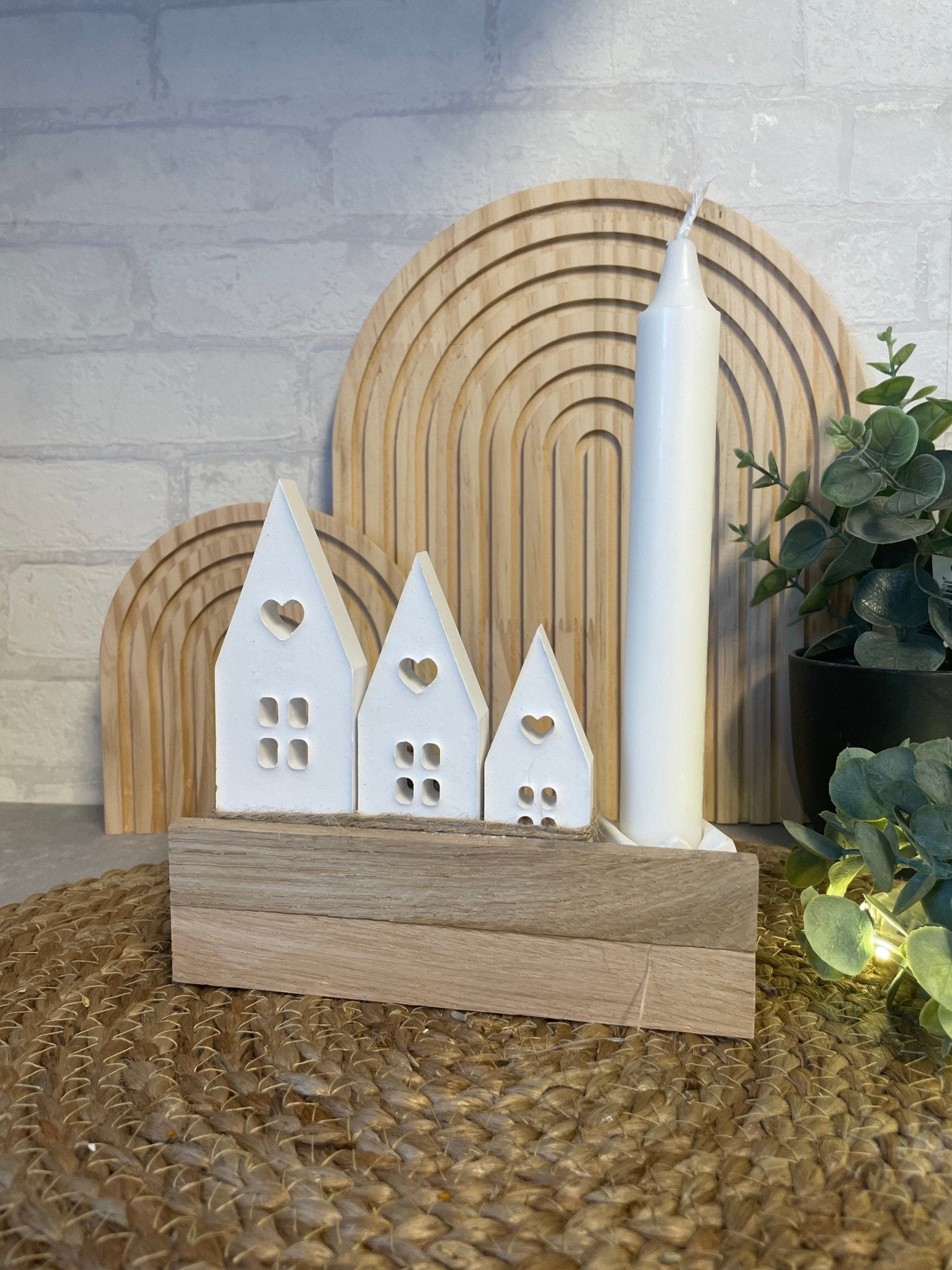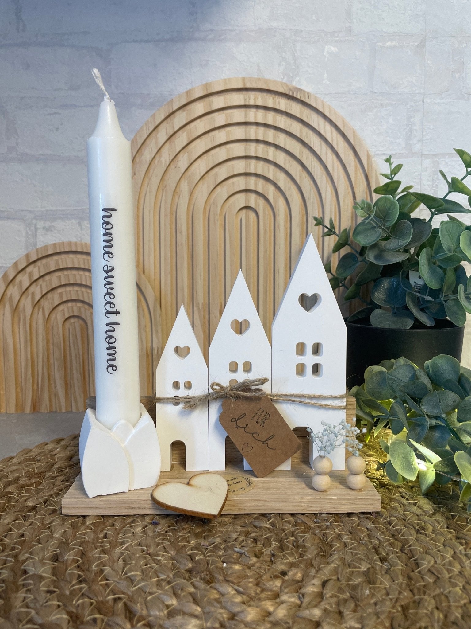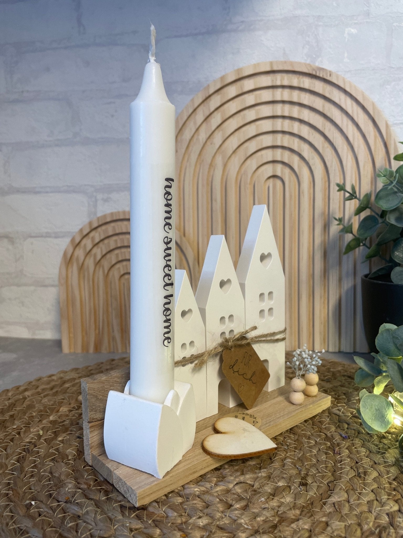 Holztablett 16 x 7 cm, 3er Set Haus, Kerzenhalter. Kerze.