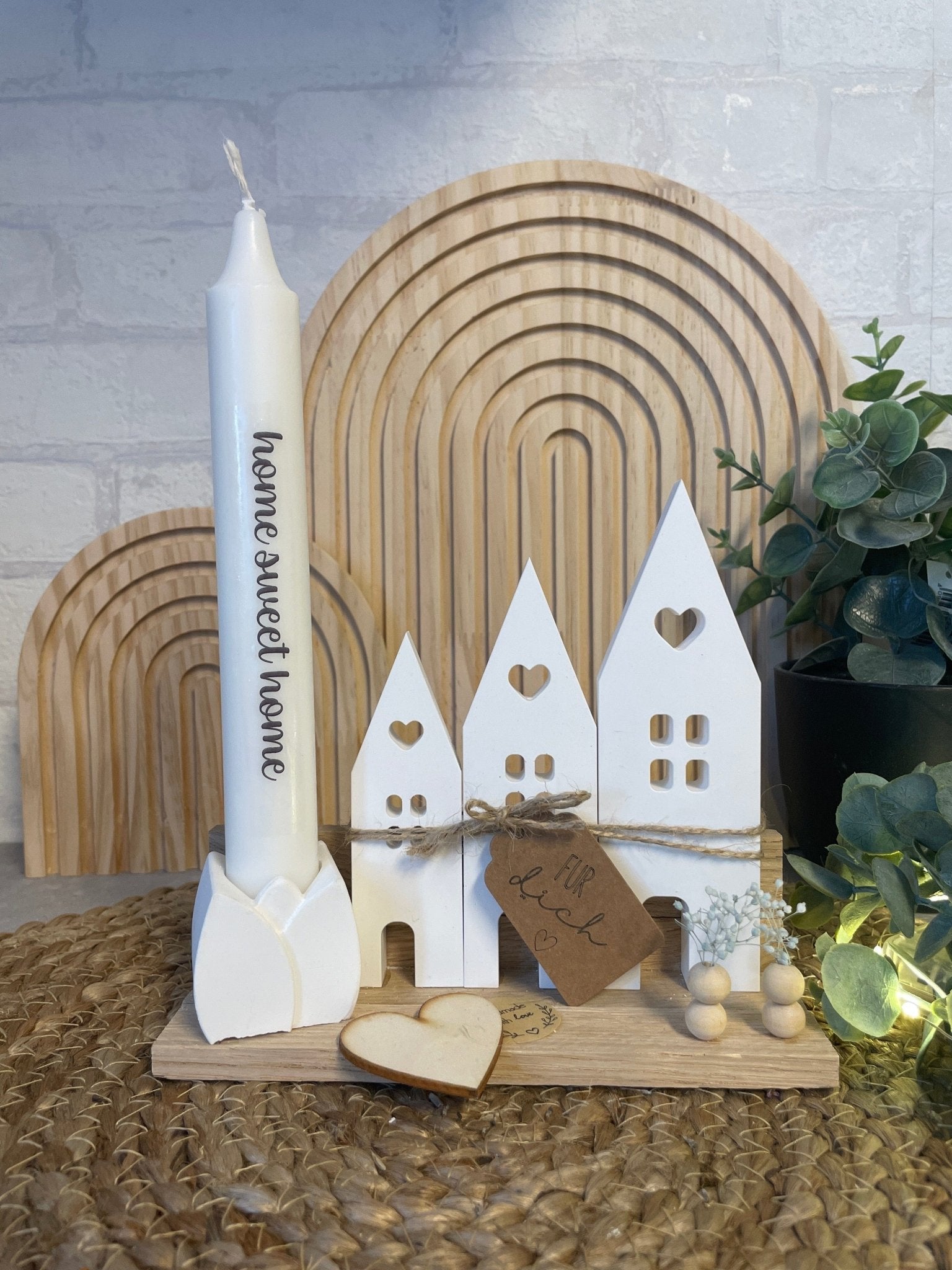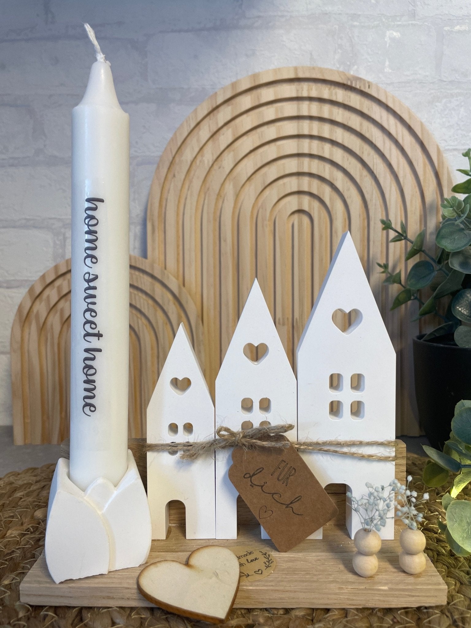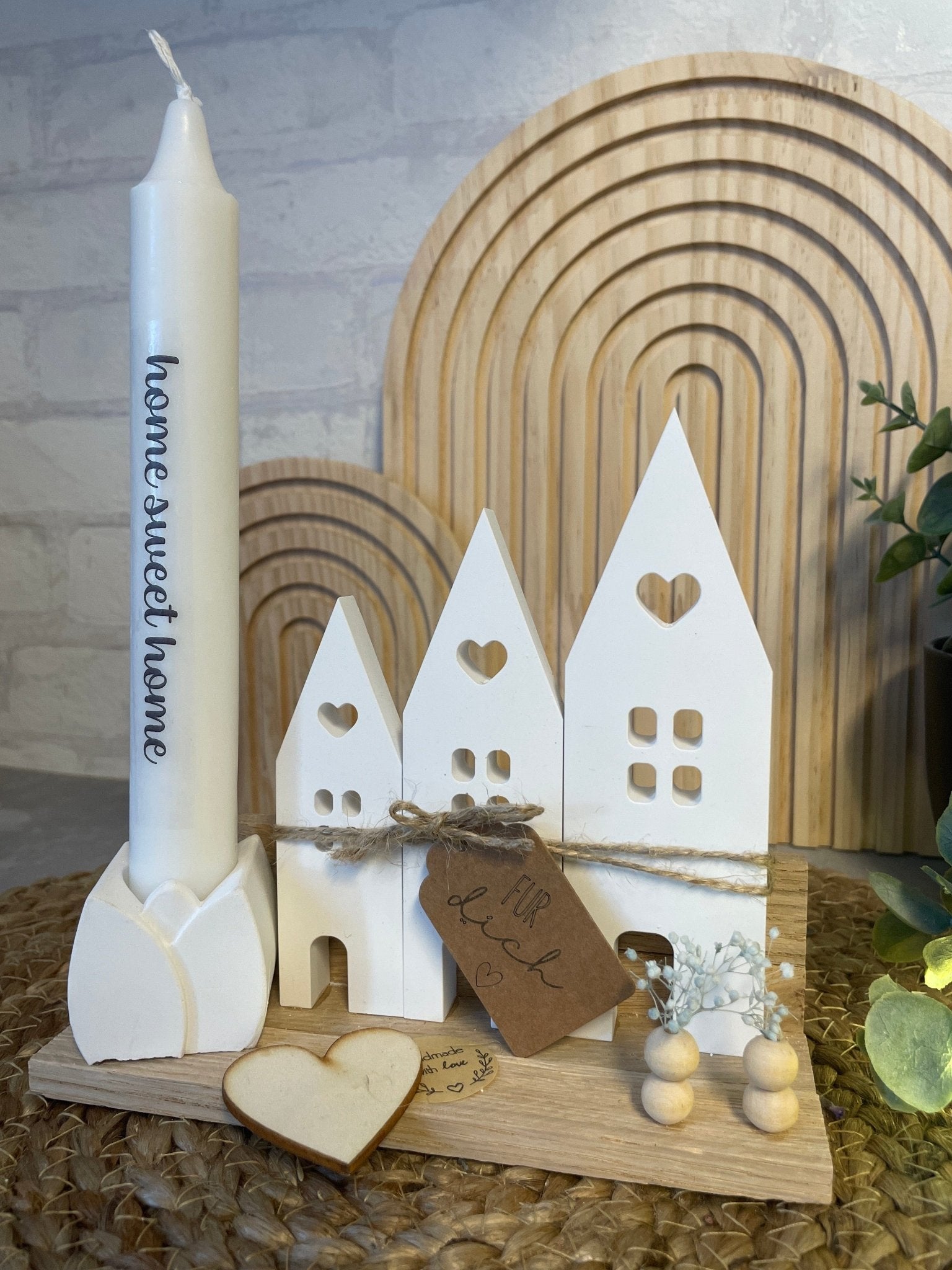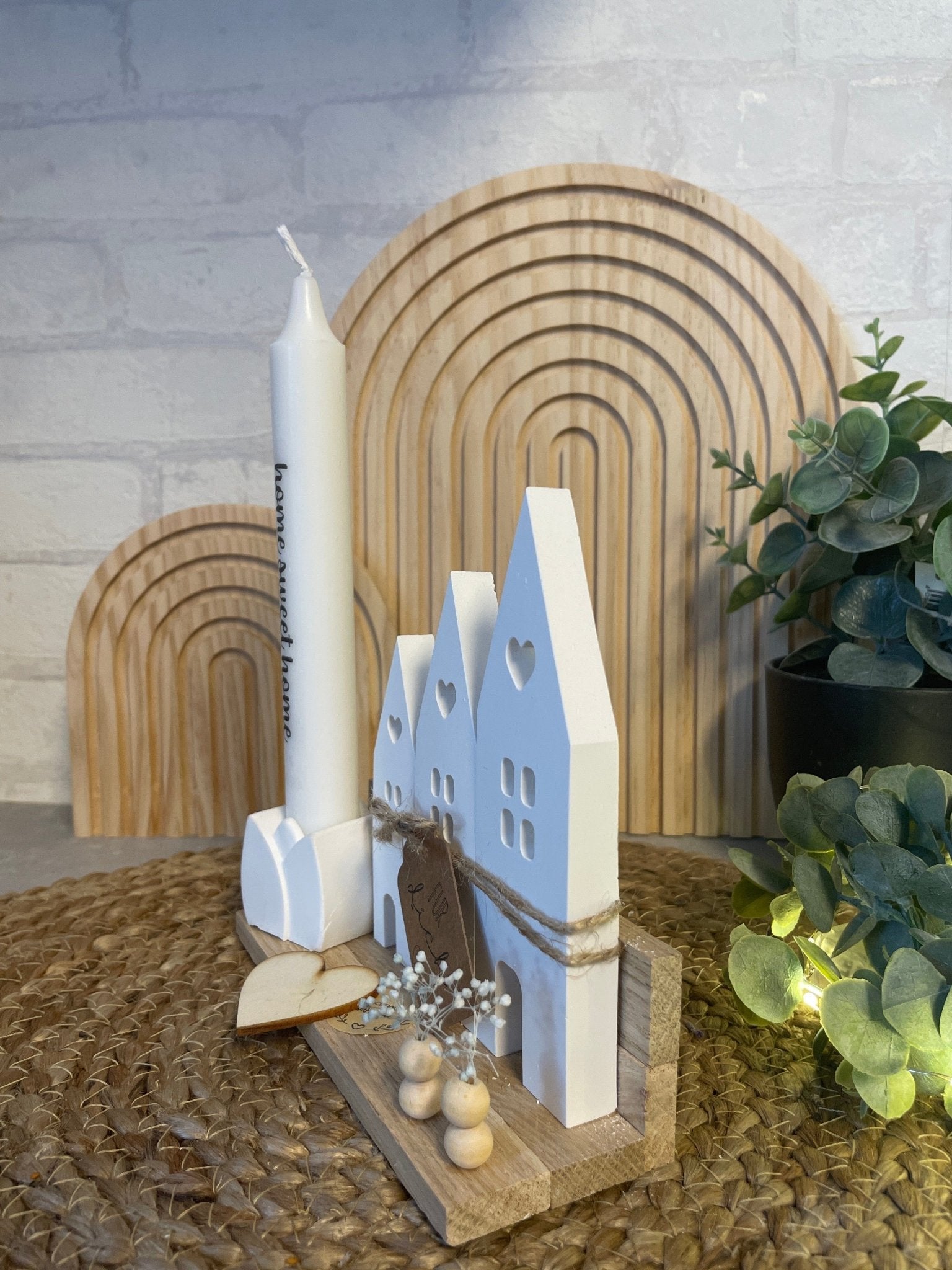 Holztablett 16 x 7 cm, 3er Set Haus, Kerzenhalter. Kerze.
