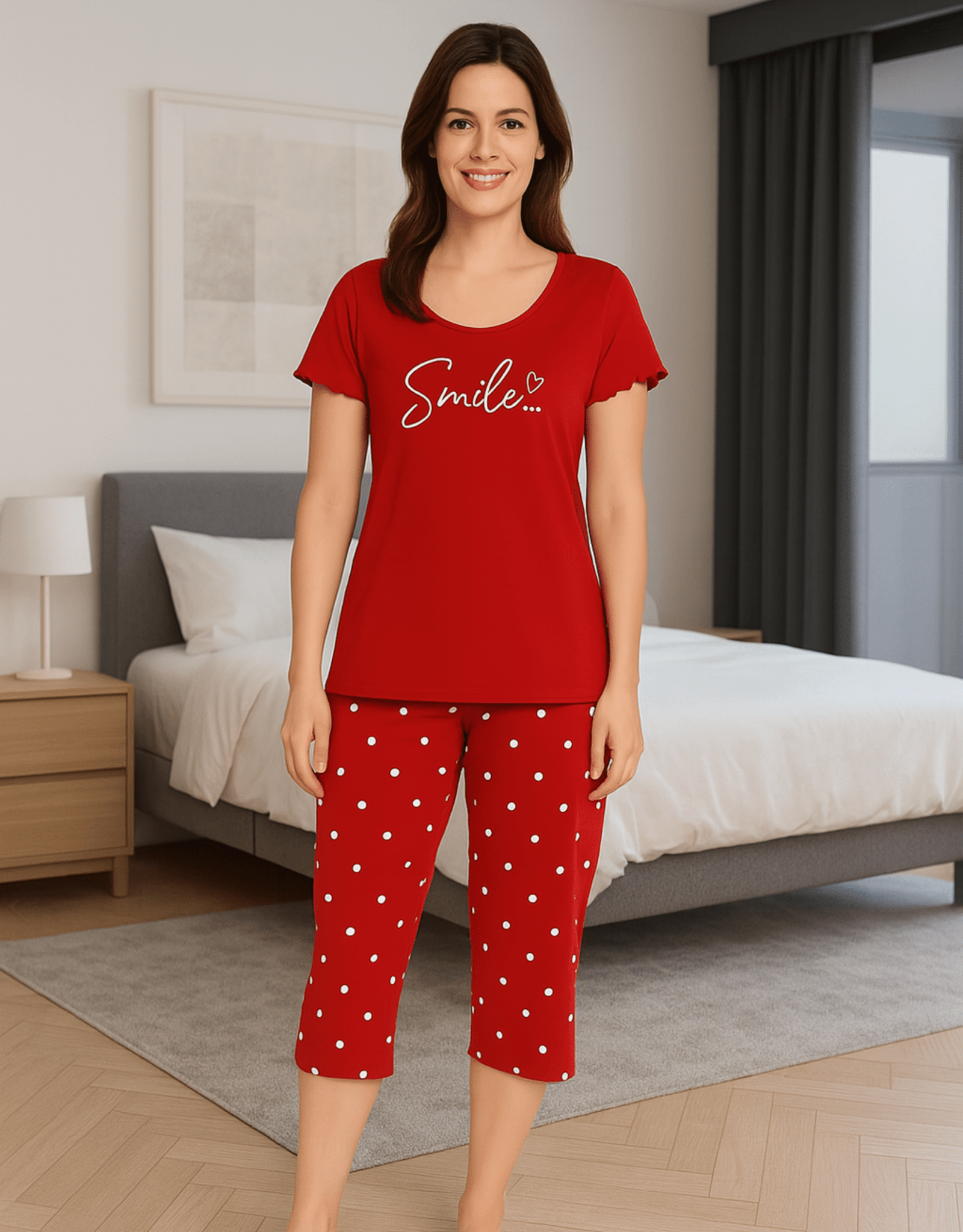 Damen Pyjama Set – Roter 2-teilig Schlafanzug mit Print & 3/4 Hose