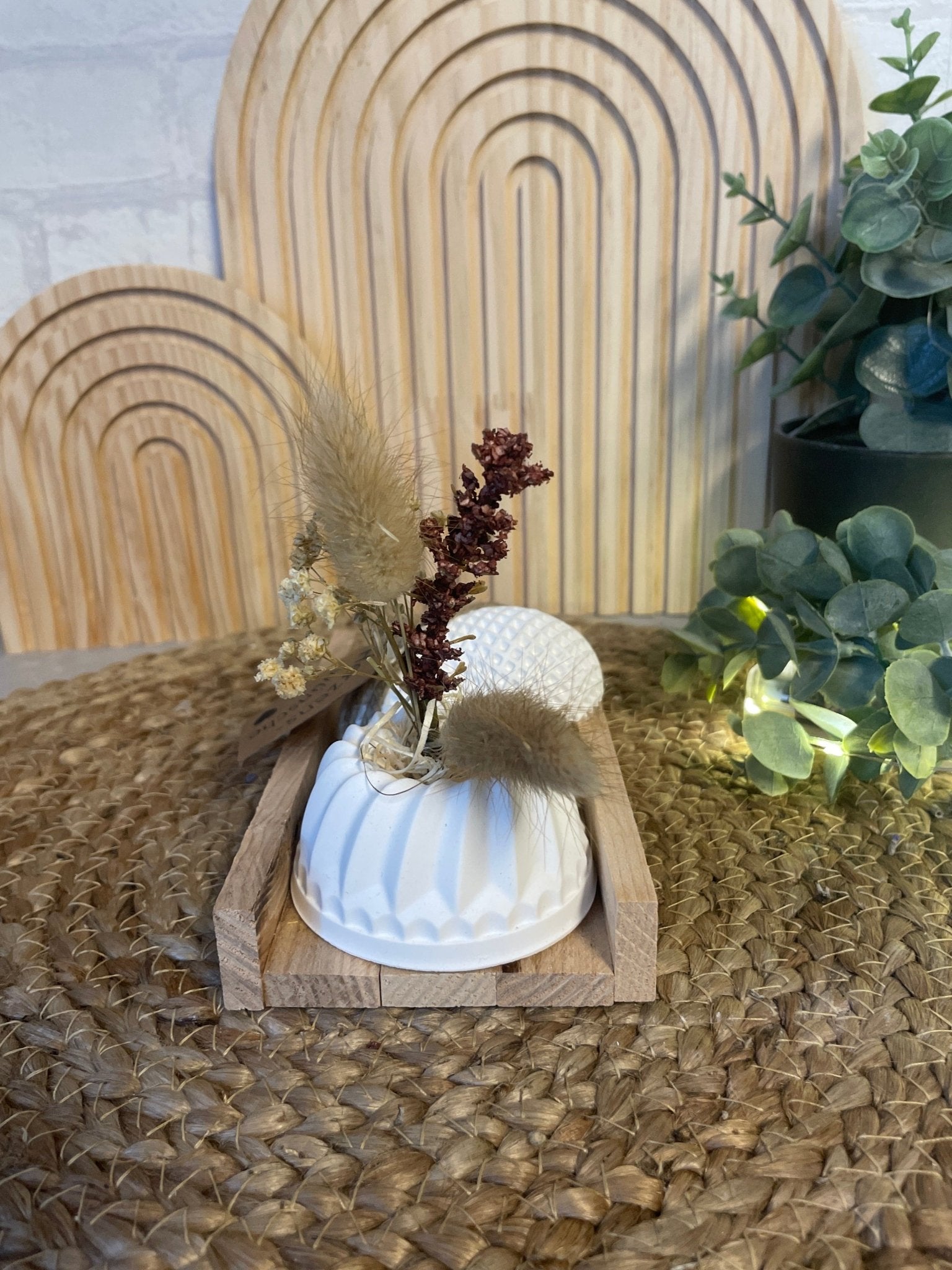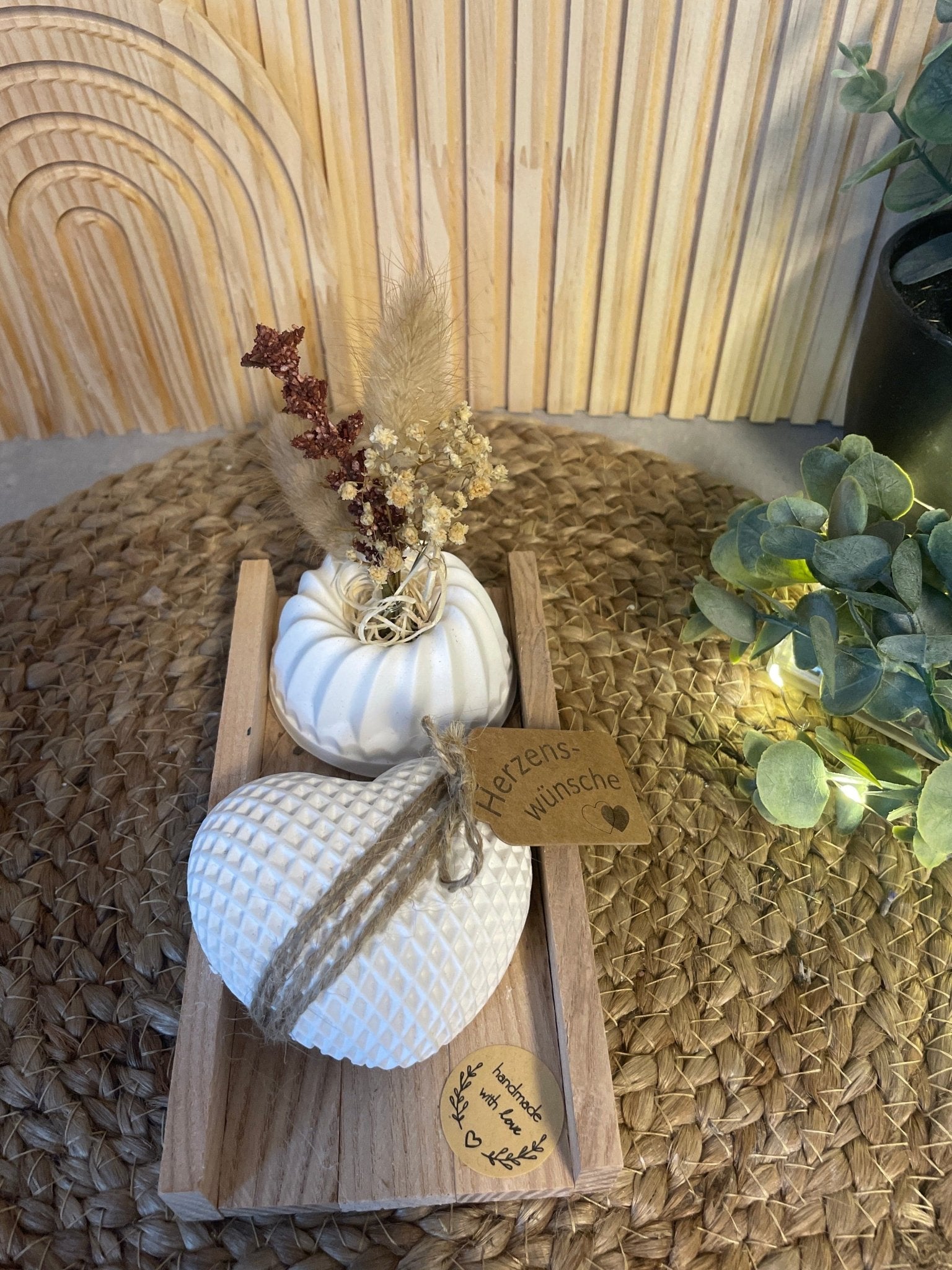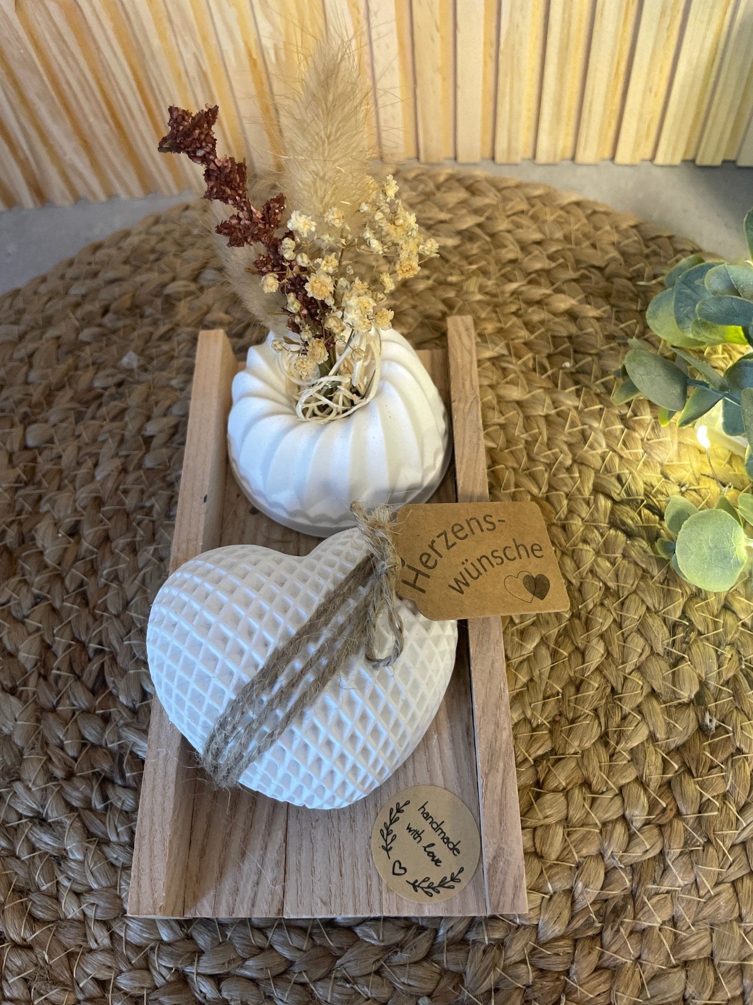 Holz Ablage 16 x 8,5 cm, zwei kleine Herzen 5 cm aus Keraflott, Kerzenhalter aus Keraflott 6,5 x 3,5 cm, Trockenblumen, Bei den Trockenblumen kann man die Farbe wählen, und fürs Holz gibt es verschiedene Optionen.