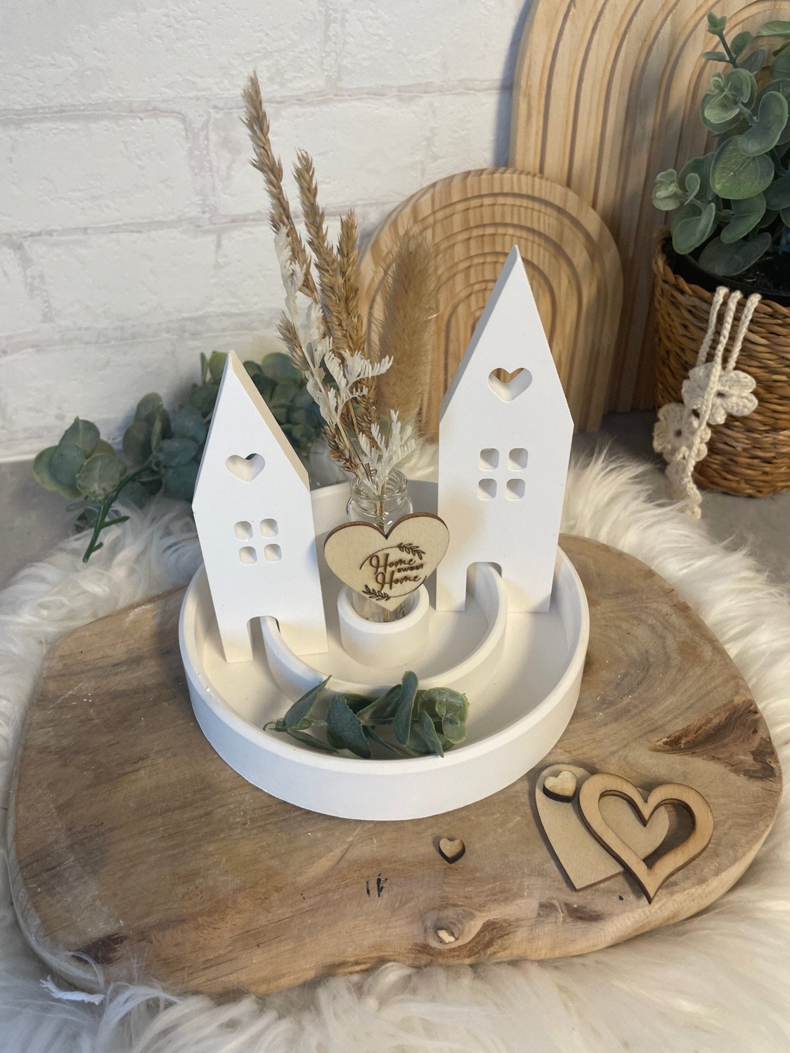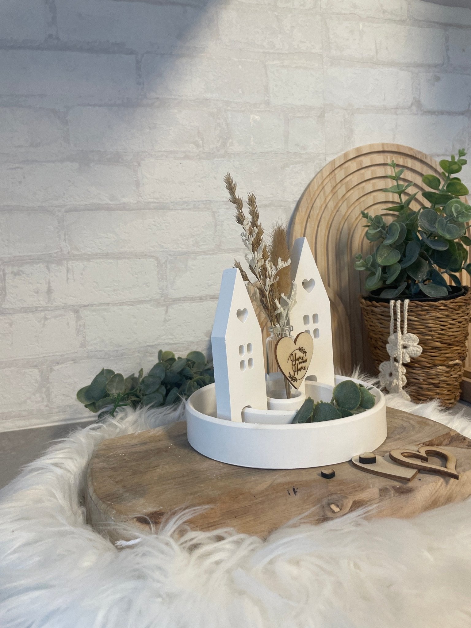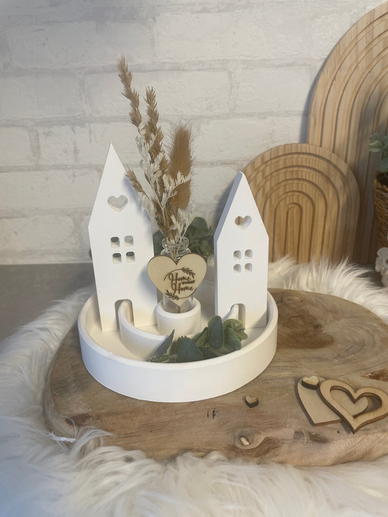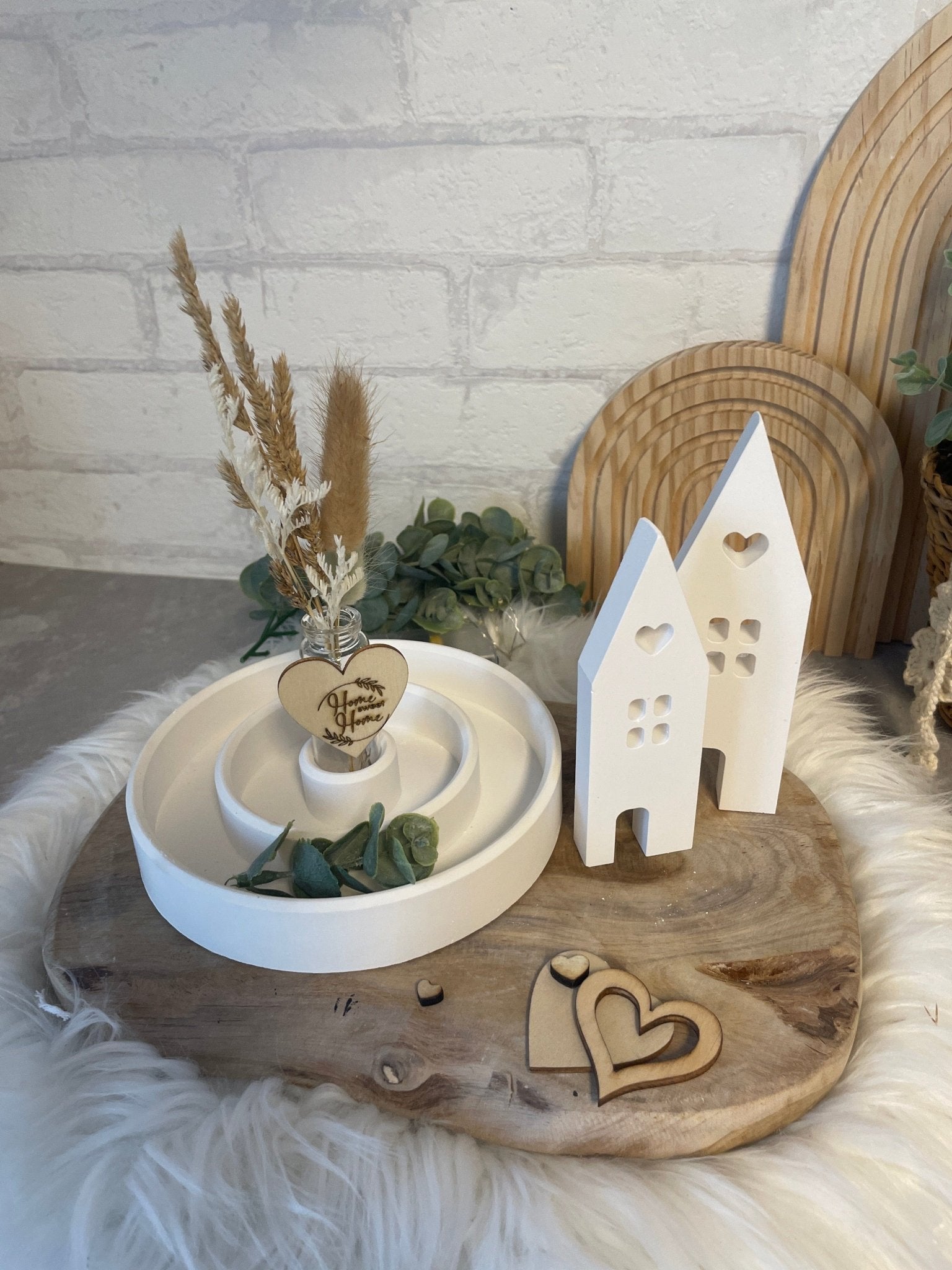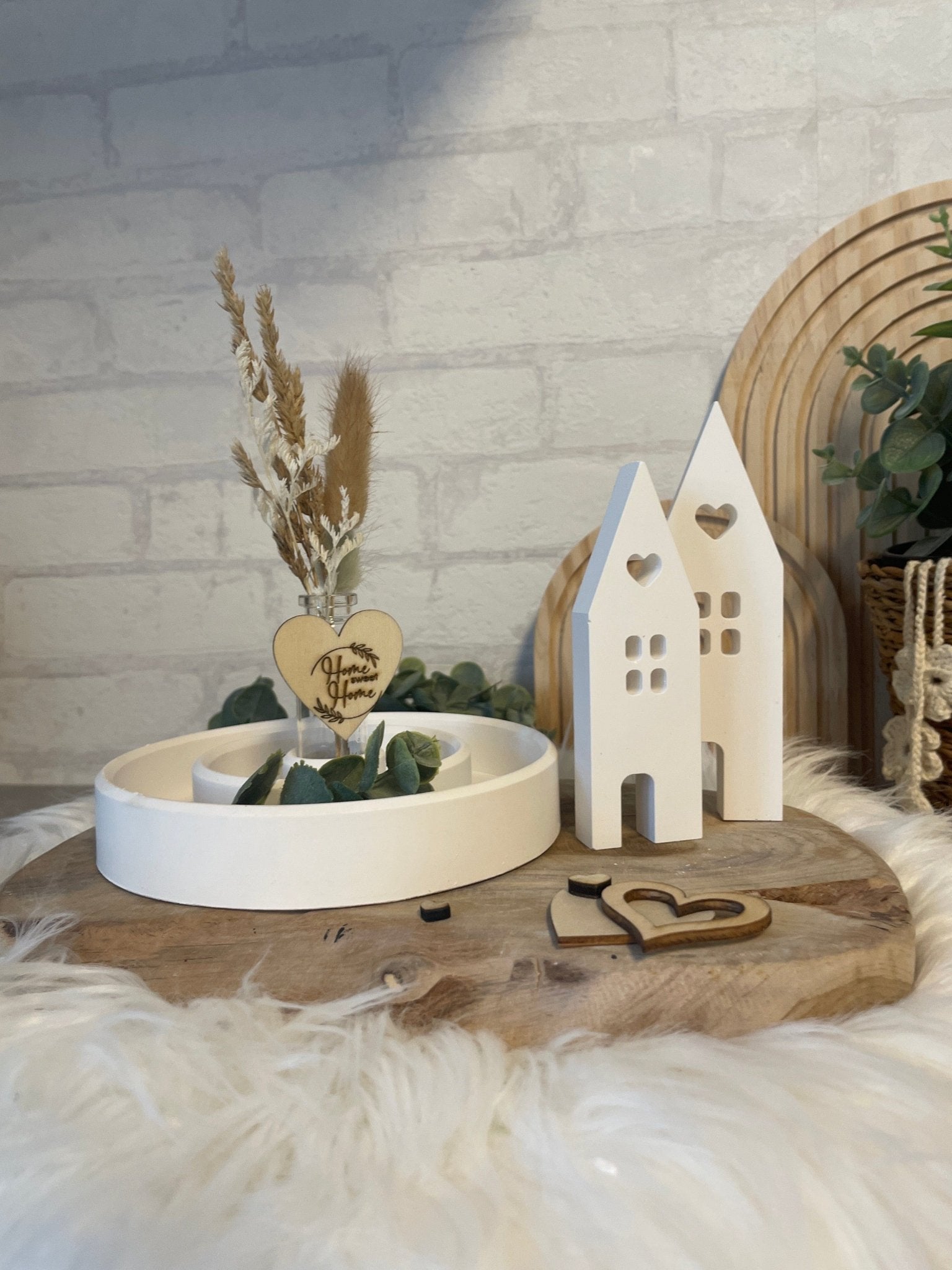 Teller 13,5 cm, großes Haus 13 x 4 x 1 cm, kleines Haus 11,5 x 3 x 1 cm, ein Reagenzglas mit Trockenblumen, Holz Herz.