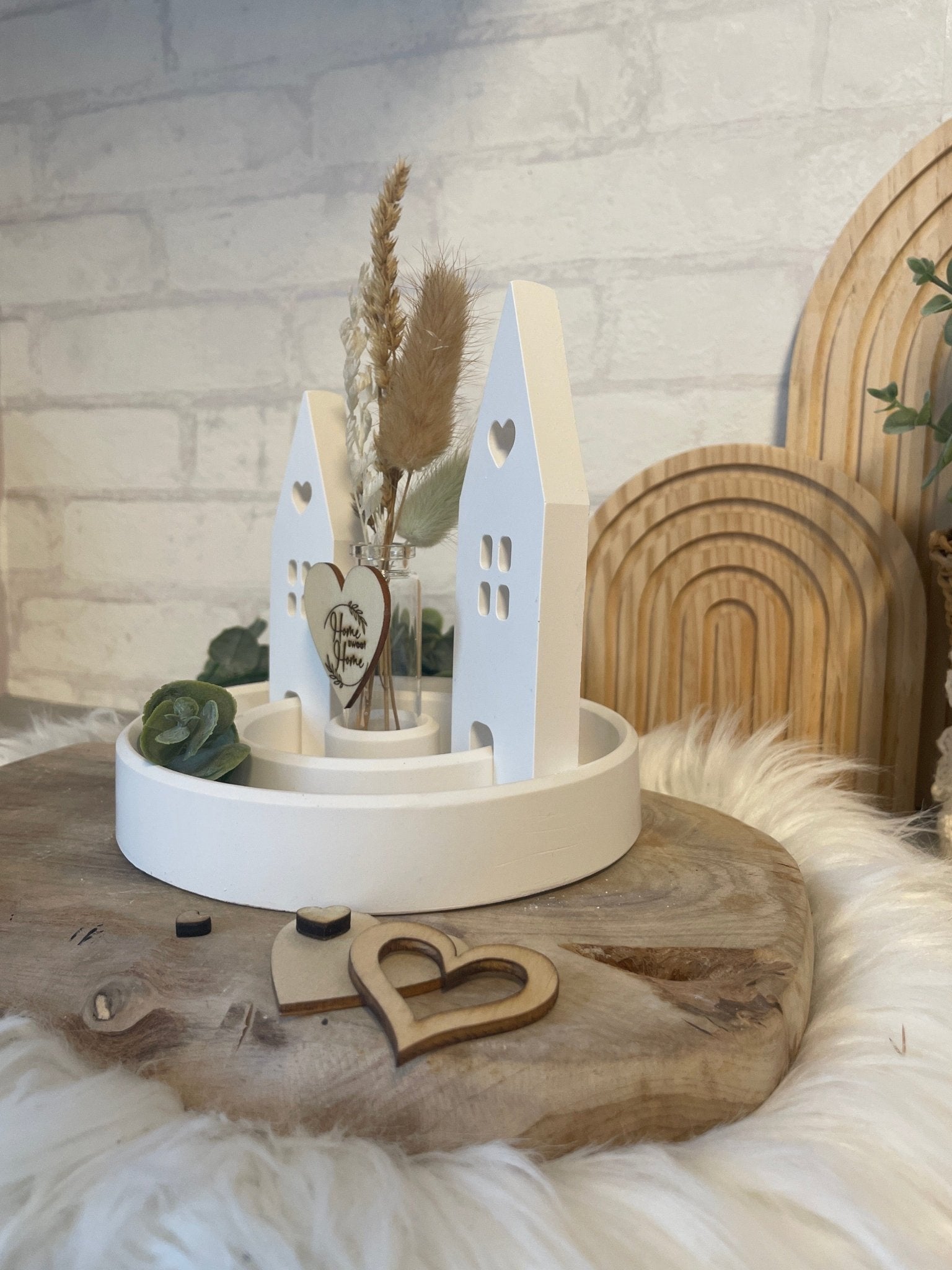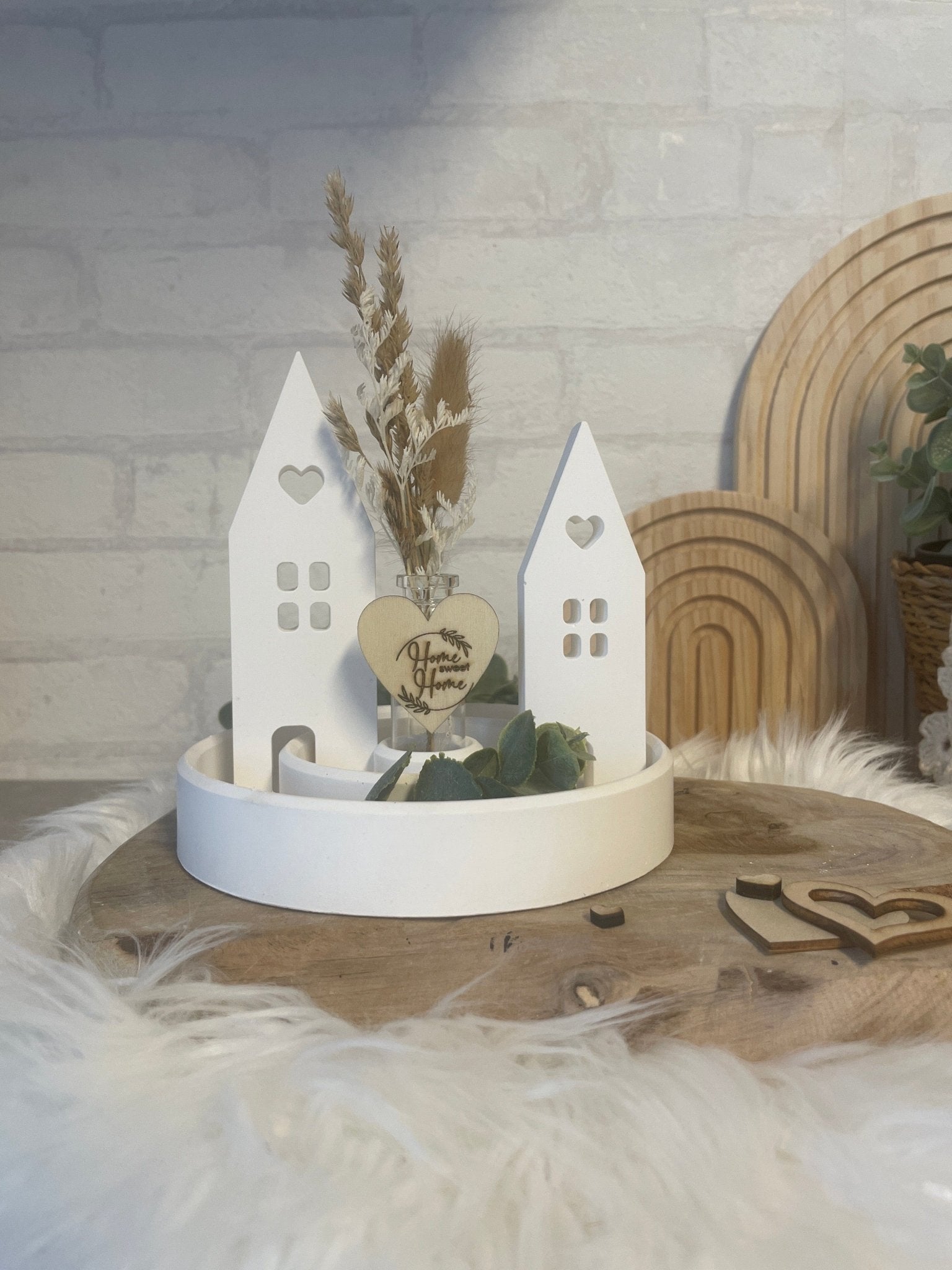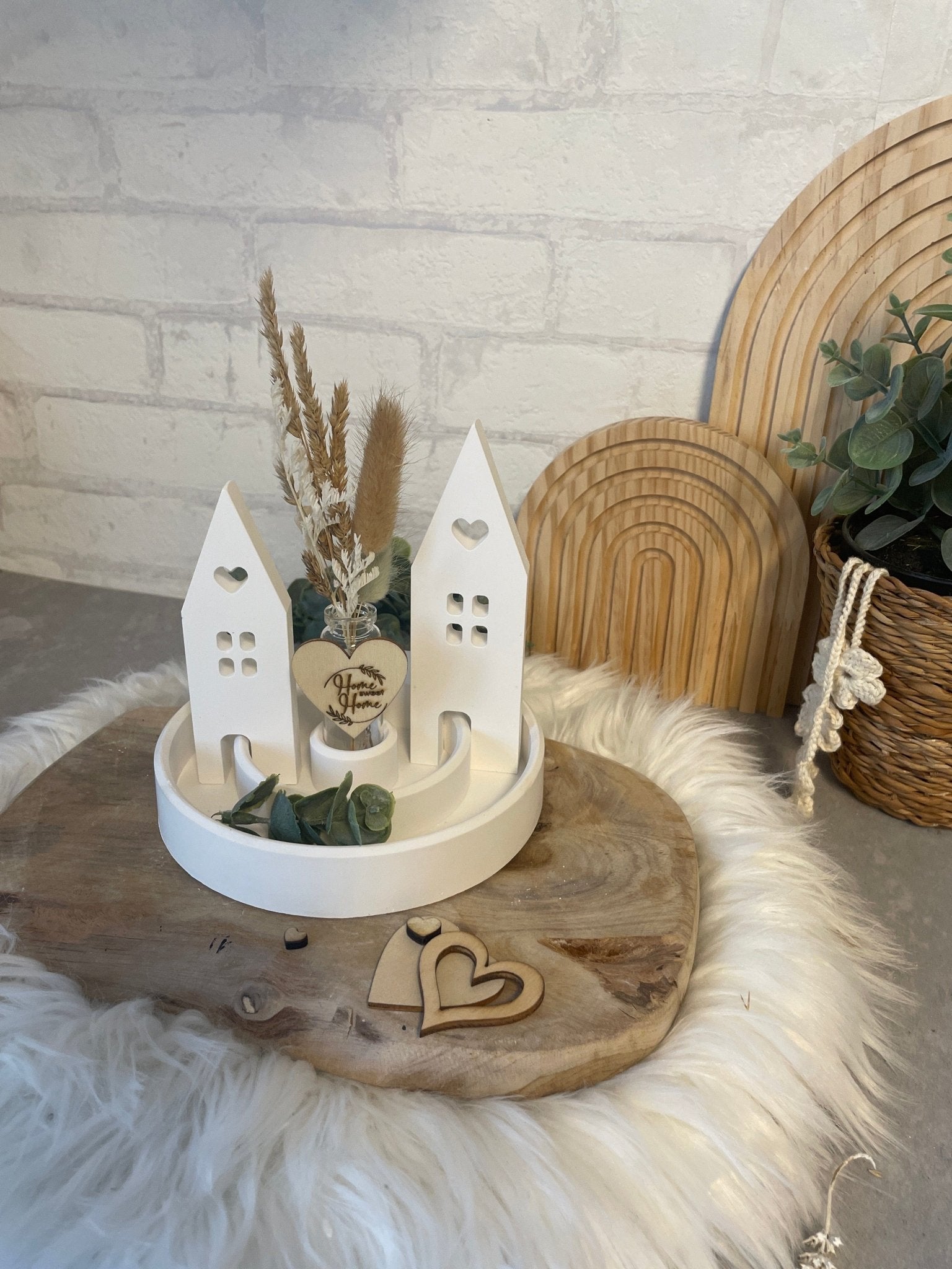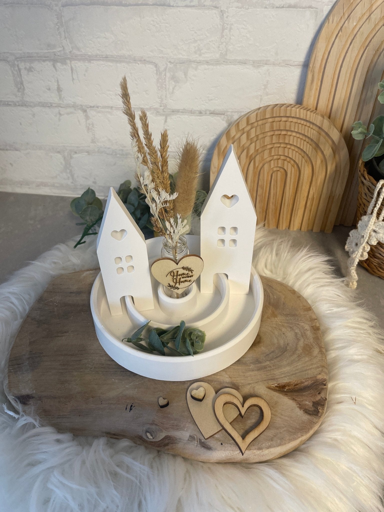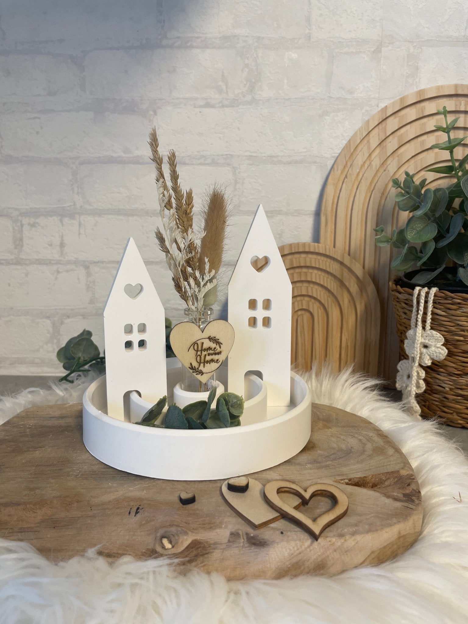 Teller 13,5 cm, großes Haus 13 x 4 x 1 cm, kleines Haus 11,5 x 3 x 1 cm, ein Reagenzglas mit Trockenblumen, Holz Herz.