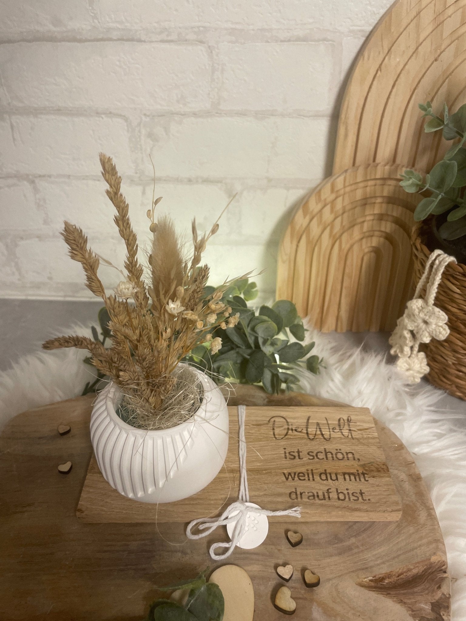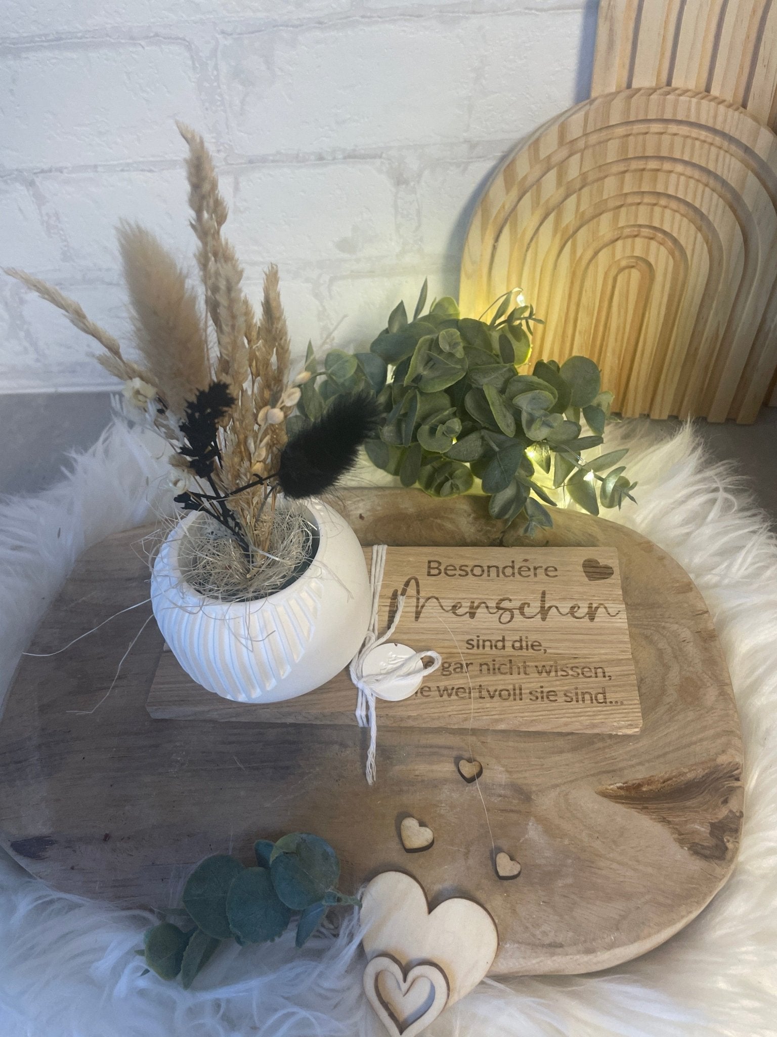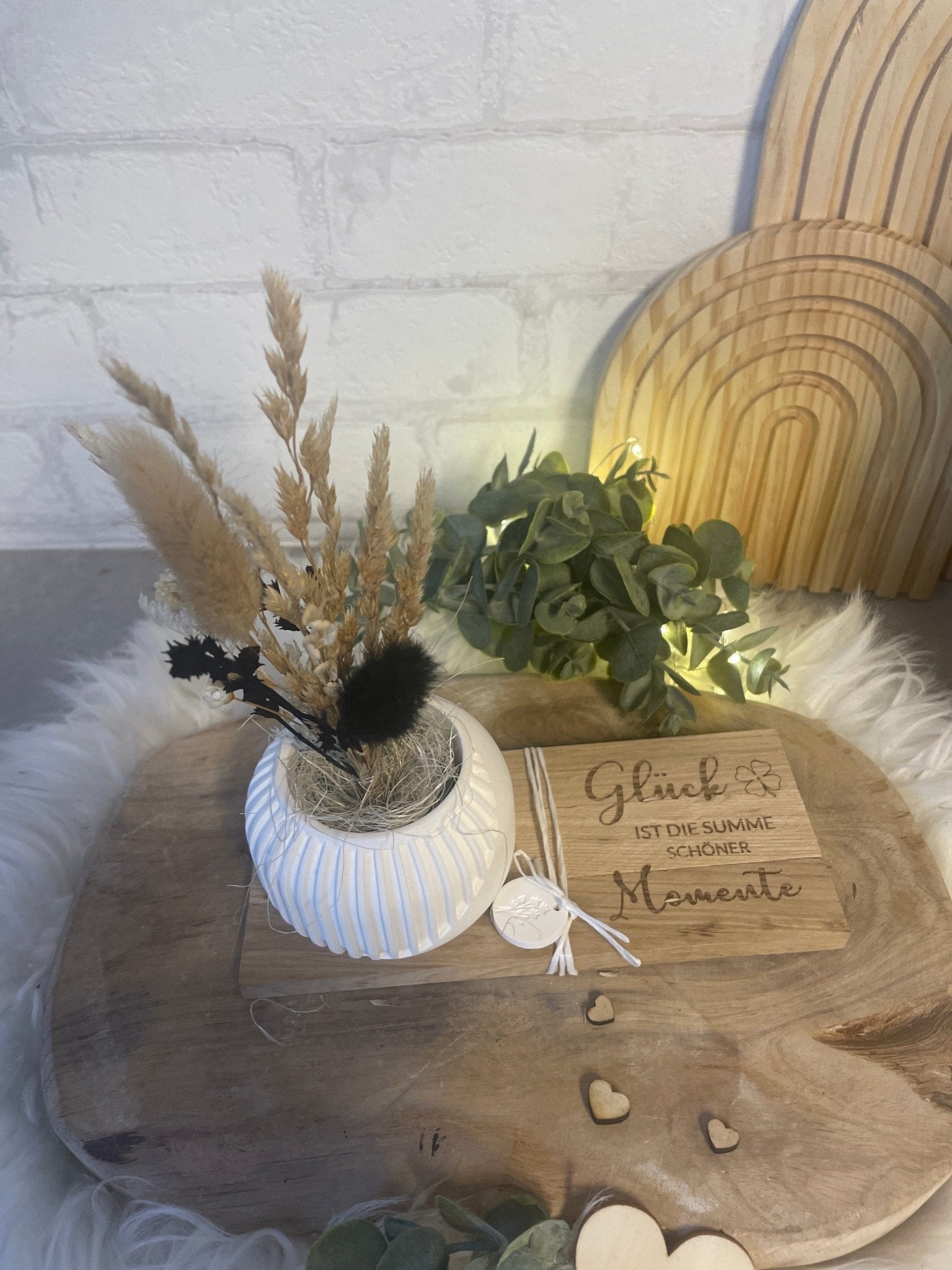 Vase mit Trockenblumen & Gravur – Geschenkidee auf Holztablett