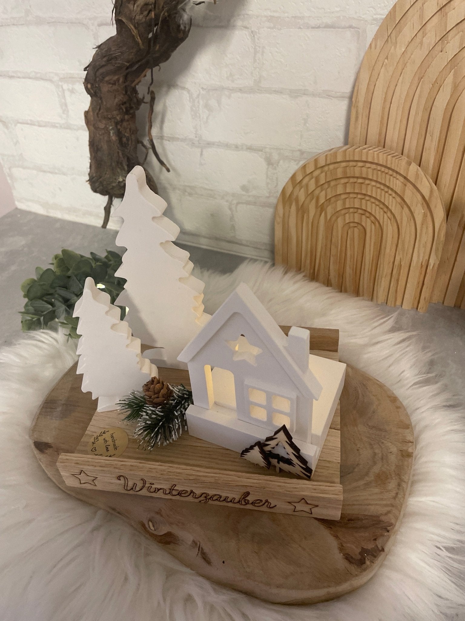 Winterzauber Holzdeko mit LED-Haus & Tanne – Handgemachte Winterdekoration